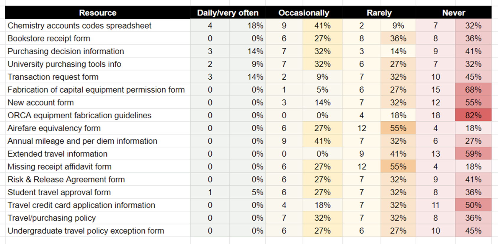 Interestingly, the documents were used even less than we expected: over half of the respondents indicated that they never used 30% of the documents* available for faculty and staff members.