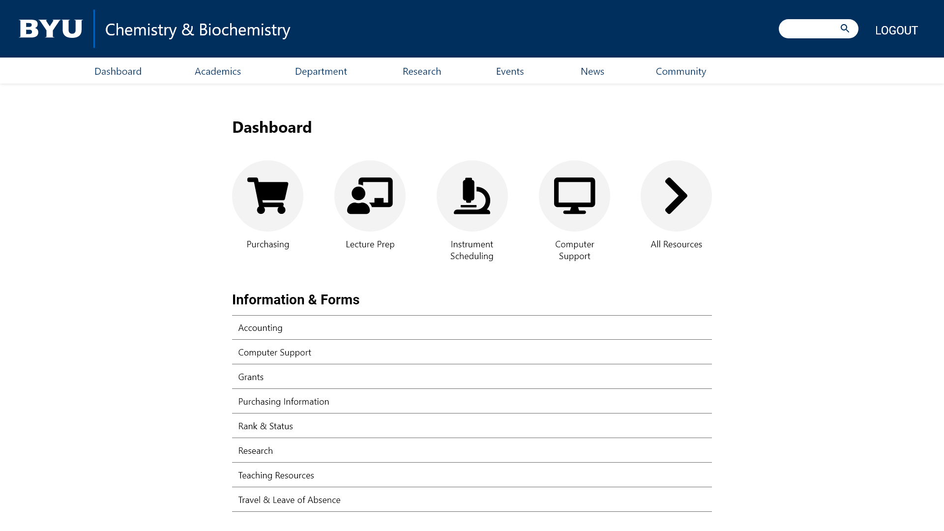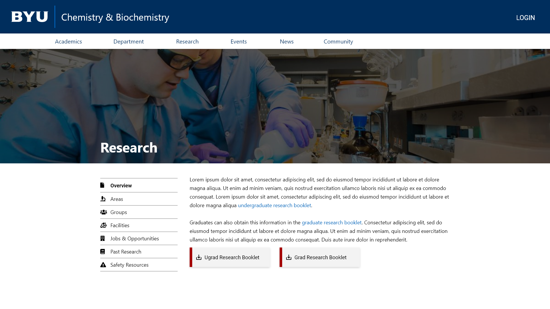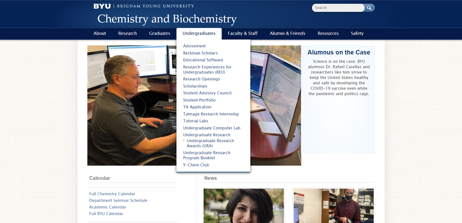 The Chemistry site is the main website for BYU’s Department of Chemistry and Biochemistry. Its purpose is to attract prospective students, provide information to current students, and gather support for the department.
