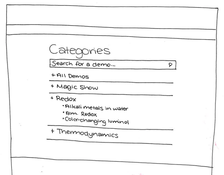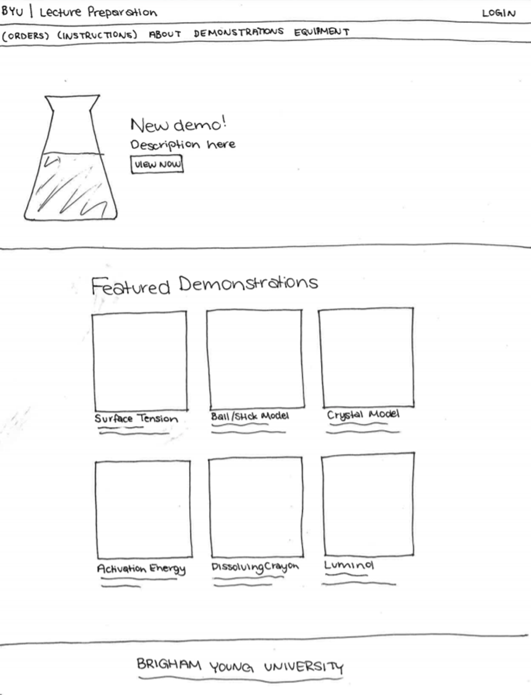 The first wireframe of the homepage highlighted a new demonstration as well as a randomized list of featured demonstrations.