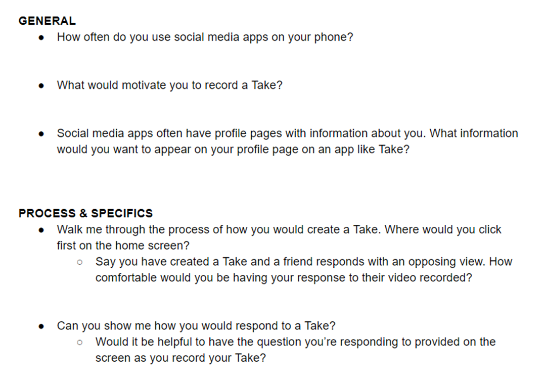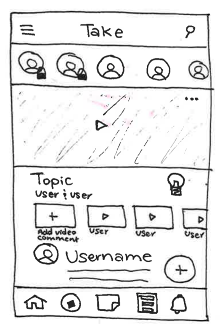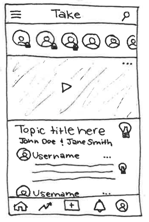 After formalizing my understanding of social media apps, I began wireframing. I focused primarily on creating and displaying Takes since users would primarily be engaged in these functions. This meant that I spent a considerable amount of time designing the homepage.