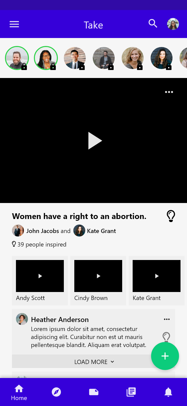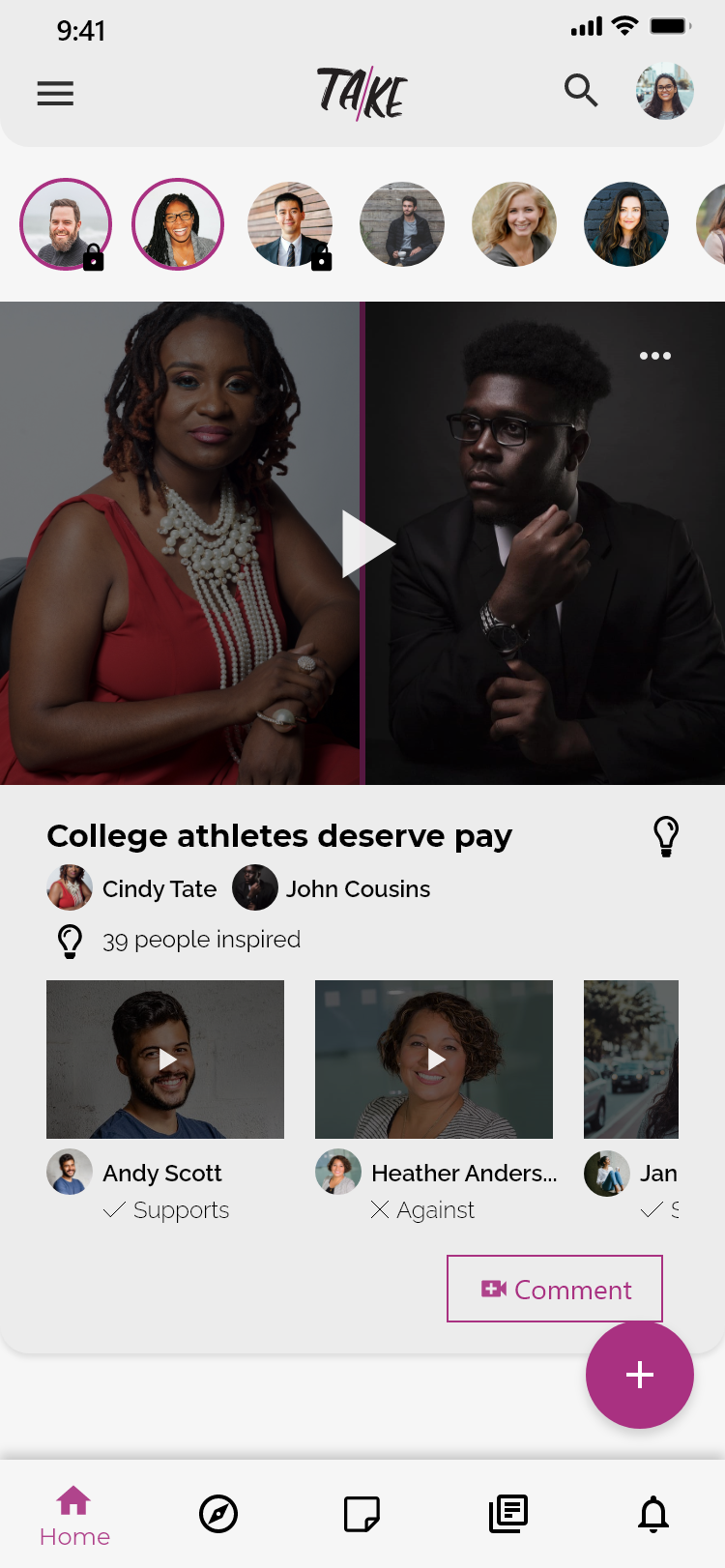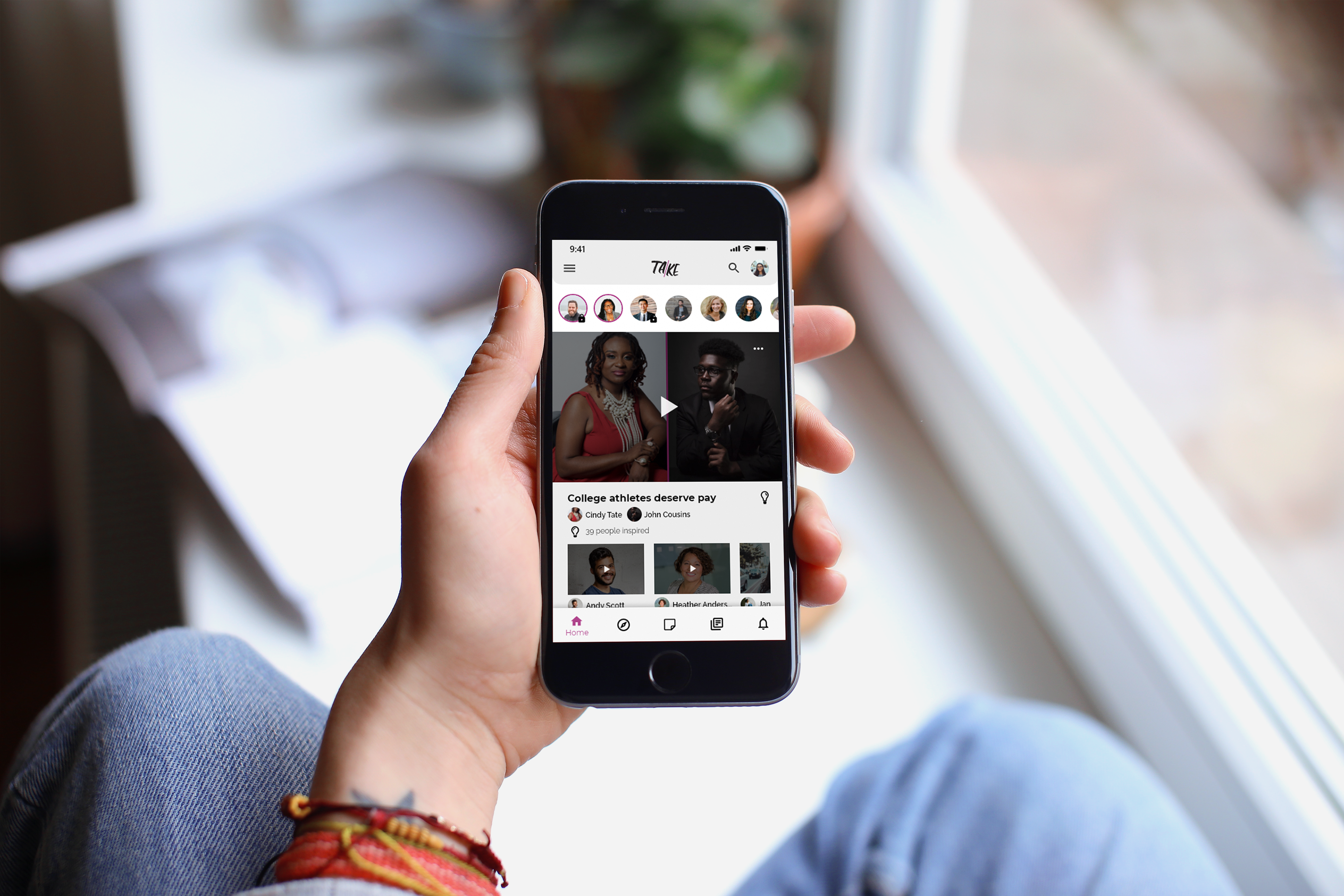 Take is an innovative new social media platform designed to bring discussion to a safe platform. It allows users to record videos ("Takes") of themselves and invite others to respond, imitating an in-person discussion. Takes can be sorted into pages that allow users to browse topics and key arguments, fostering an environment of understanding.